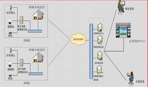 报警系统与视频系统联动,管理系统内各种报警事件及其联动处理,对报警消息进行分发及上传。商铺安装相应的报警输入、输出设备,当有报警产生时,第一时间触发警号、声光报警器等报警输出设备,对非法份子起到震慑作用;与此同时,报警信号通过网络传送到监控中心,值班人员通过视频监控对时间进行复核、处理。另外,当有报警发生时,还可以进行短信通知和邮件通知。