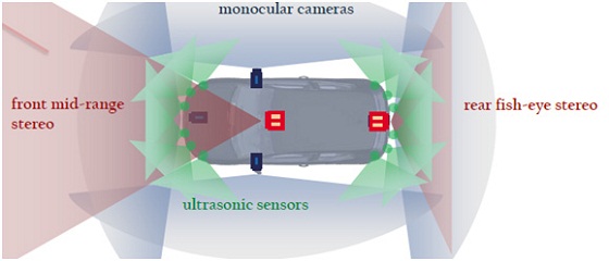 摄像头+超声波传感器被安排成360°覆盖周围环境。